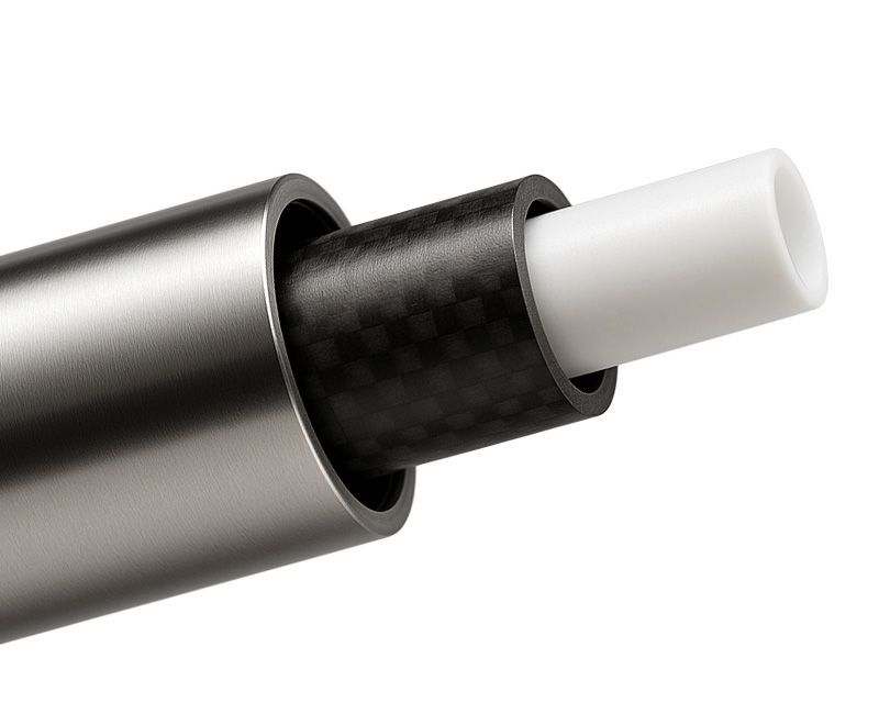 The new GTS armtube combines an aluminium or titanium outer tube with a suspended carbon-fibre inner tube, bonded with specialised damping material. This multi-material structure delivers exceptional stiffness and vibration control, making the armtube far more inert and stable than typical single-material armtube designs.